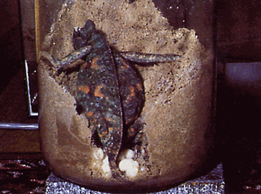 | Trächtigkeit: Nach mehreren Tagen und Paarungen bekommt das Weibchen seine wie oben beschriebene Färbung und muss unbedingt vom Männchen getrennt werden um Dauerstress durch ihn zu vermeiden. Sie entwickelt dann ähnlich schwangeren Frauen in dieser Zeit einen ordentlichen Appetit. Es ist unglaublich wieviel sie dann fressen können. Mein Weibchen frass täglich 8 bis 10 ausgewachsene Heuschrecken! Nach ungefähr einem Monat hat sie deutlich an Körperumfang zugenommen und die Eiablage folgte wenige Wochen später. Eine Woche zuvor verweigerte sie die Nahrungsaufnahme und fing an Probegrabungen im Terrarium zu machen. Zur Eiablage empfiehlt es sich einen zusätzlichen Behälter (in meinem Fall war das ein kleines Aquarium, das ich ca. 20 cm mit lockerem Torf - Sand Gemisch gefüllt habe) ins Terrarium zu stellen. |